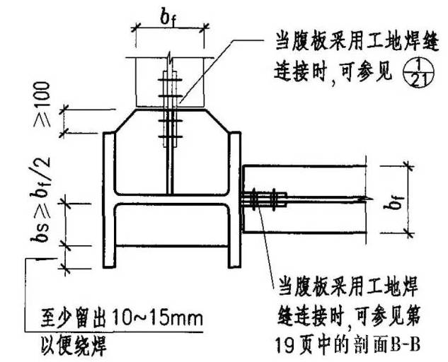 當次梁跨數較多,跨度、荷載較大時,次梁與主梁的連接宜設計為剛接,此時次梁可視作連續梁,這樣可以減少次梁的撓度,節約鋼材。次梁與主梁的剛接形式如下圖所示。