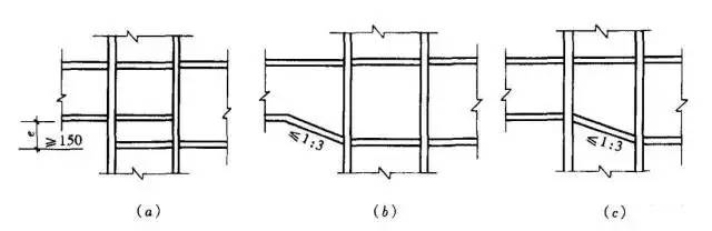當柱兩側的梁不等高時,應按兩側梁的高差分別考慮。當梁高差大于150mm時,應在兩側梁翼緣高度的分別設置加勁板;當梁高差小于150mm時,應將梁高較小的梁端做成變截面,變截面坡度小于1:3,或者設置傾斜的加勁板。