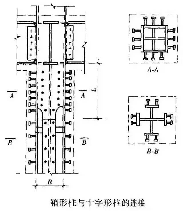兩種截面的連接處,十字形柱的腹板應伸入箱形柱內,形成兩種截面的過渡段。伸入長度應不小于柱寬加200mm,即L≥B+200mm,過渡段截面呈田字形。過渡段在主梁下并靠緊主梁。