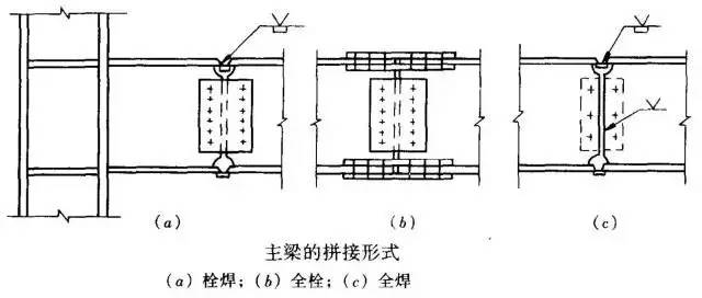次梁與主梁的連接通常設計為鉸接,主梁作為次梁的支座,次梁可視作簡支梁。其拼接形式如下圖所示,次梁腹板與主梁的豎向加勁板用高強度螺栓連接(圖a、b),當次梁內力和截面較小時,也可直接與主梁腹板連接(圖c)。