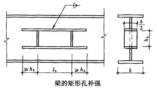 梁腹板上開矩形孔時,對腹板的抗剪影響較大,應在洞口周邊設置加勁板,其縱向加勁板伸過洞口的長度不小于矩形孔的高度,加勁肋的寬度為梁翼緣寬度的1/2,厚度與腹板相同,如下圖所示。
