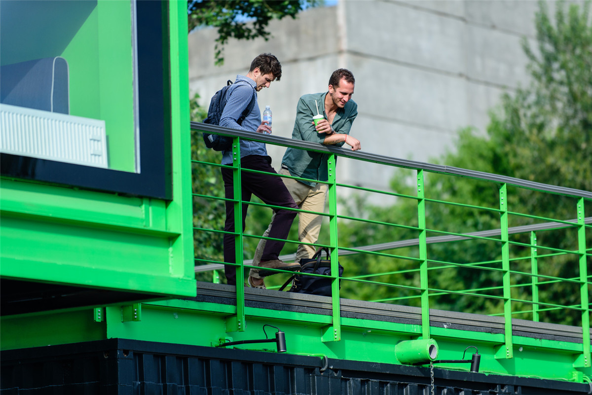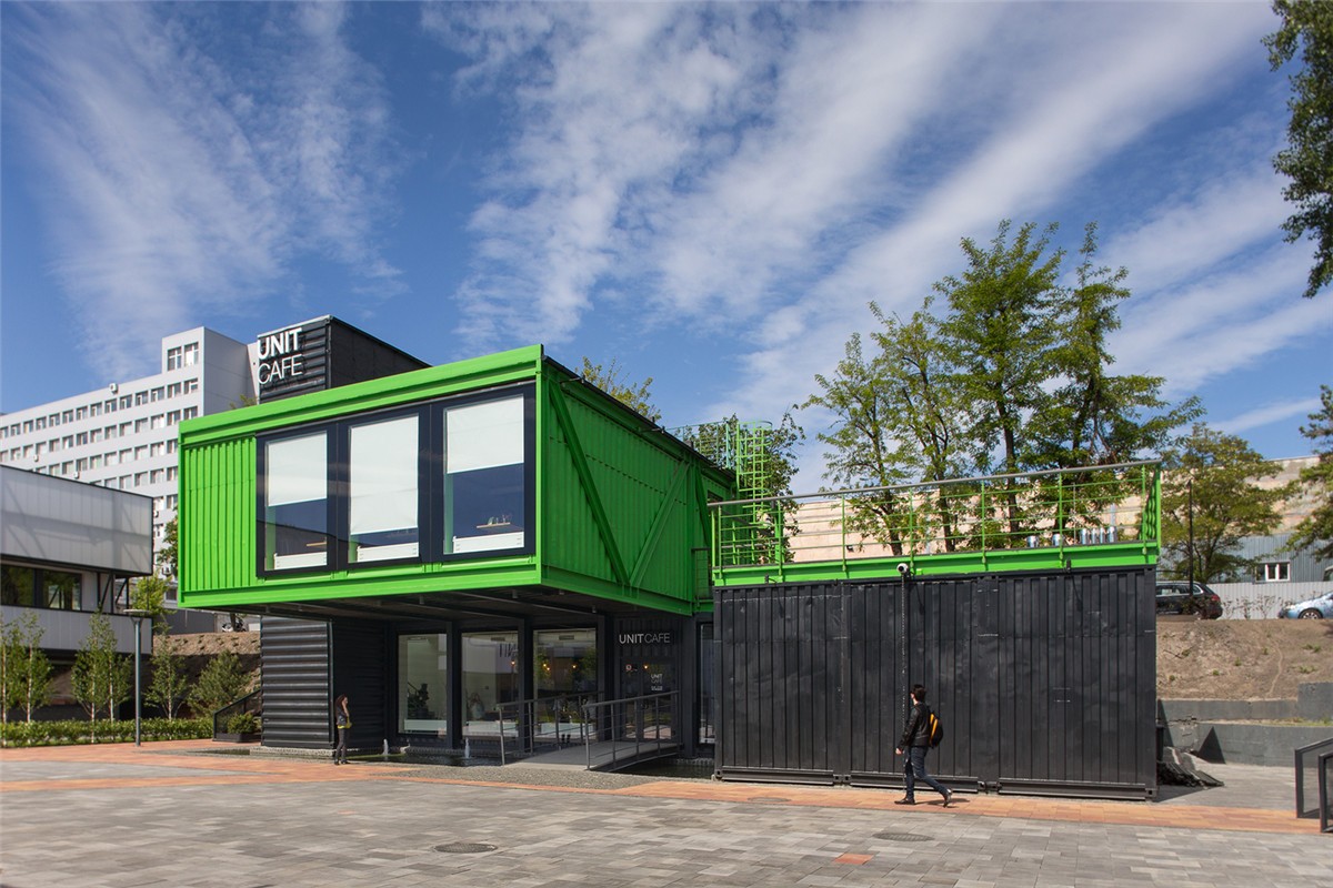 在 Unit Cafe 項目的實施中使用了14個海運集裝箱,其中一個是垂直的,里面有一個樓梯。二樓有一個位于底層的控制臺上的開放式露臺。二樓的控制臺為7.5米。它有一個很好的朝向?qū)W校和商業(yè)中心的視野。一側(cè)的水面朝向橋的入口處。