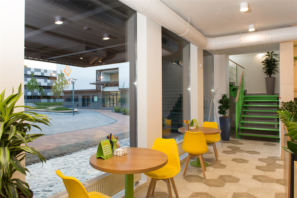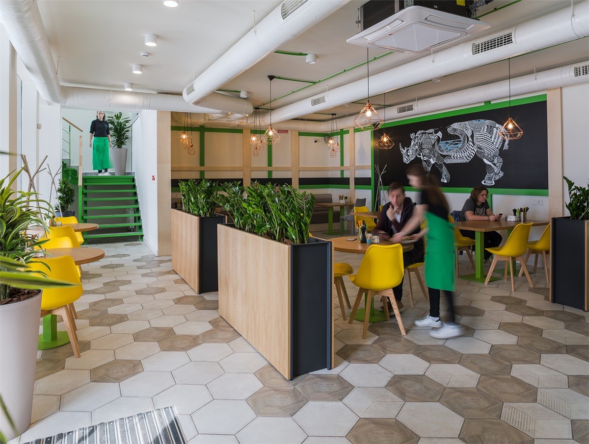 室內(nèi)外有一些共同之處。一樓也部分涂上綠色。在一樓和二樓有舒適的沙發(fā)、桌椅、椅子和植物。一樓有廚房,盥洗室和廚房??Х葟d總面積為275平方米。